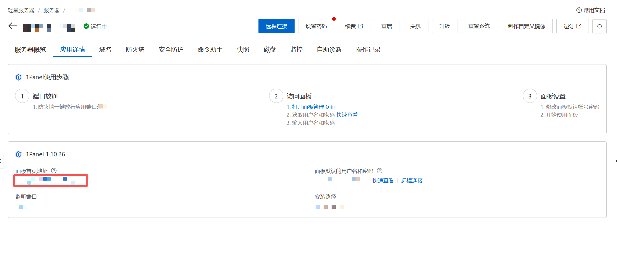进入服务器-应用详情,点击面板首页地址,即可进入服务器后台管理界面。(受安全策略限制,这里访问1panel管理界面一定要使用指定的IP+端口+/安全入口才可进入)