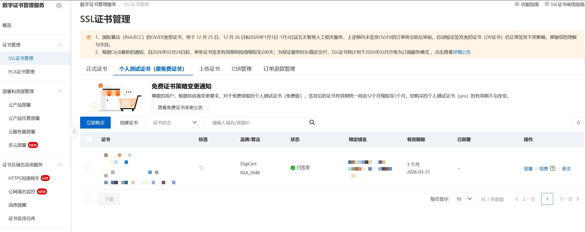 选择个人测试证书,点击立即购买,即可为你的域名购买20+张为期3个月的免费个人SSL证书。(如果使用二级域名,在SSL中填写的域名应当为二级域名)