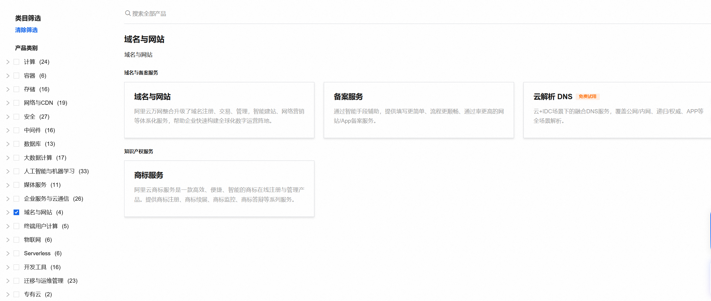 服务器购买好之后,可以根据公网IP+端口号的形式访问服务器后台管理界面,显然不够优雅,秉持着折腾就折腾好点的原则,进入阿里云域名产品界面,选购一个价格能接受,比较合胃口的域名即可。