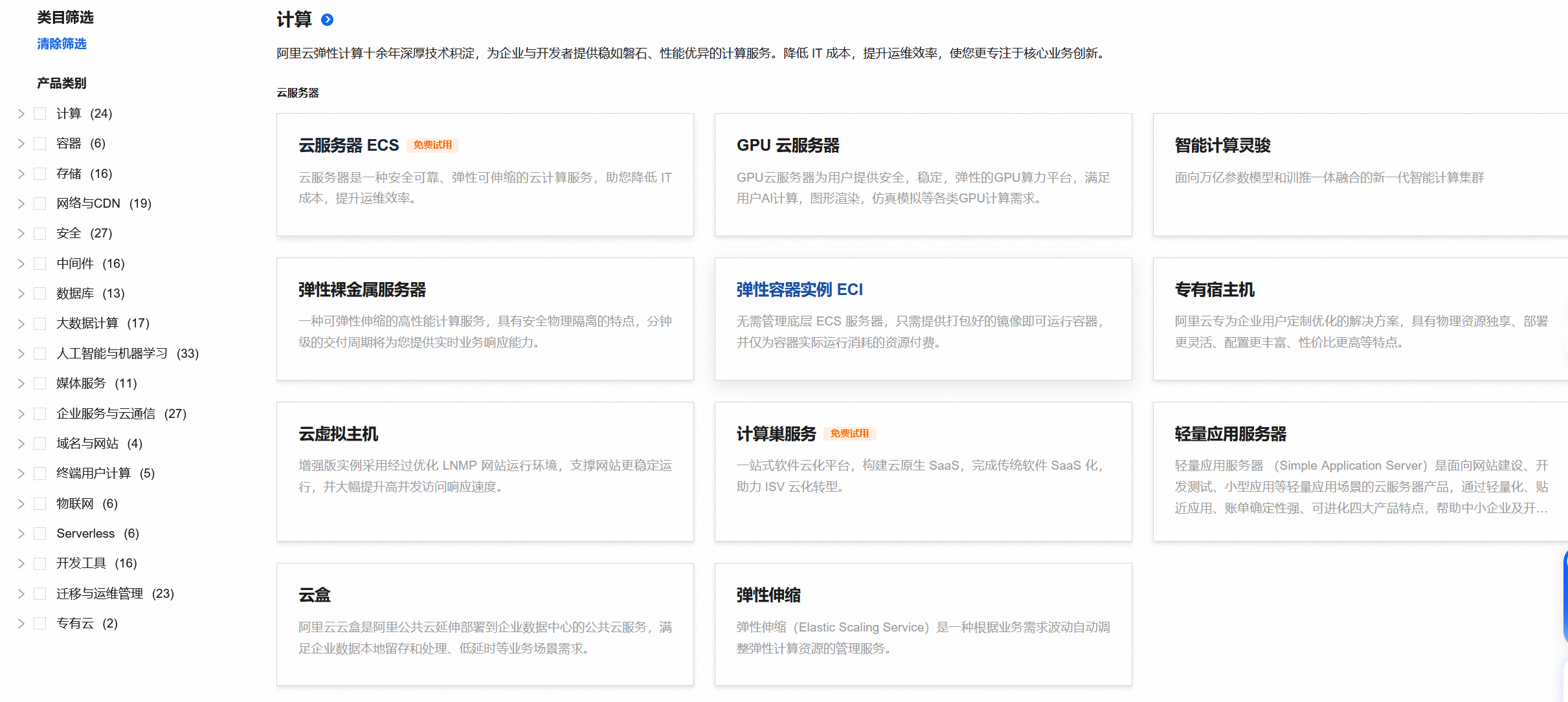 当然作为搭建博客来说,很多东西无需在意,在“计算”类别中即看到本次的目标:云服务器ECS和轻量应用服务器。两种服务器各具优势,具体的对比信息详见官方文档(