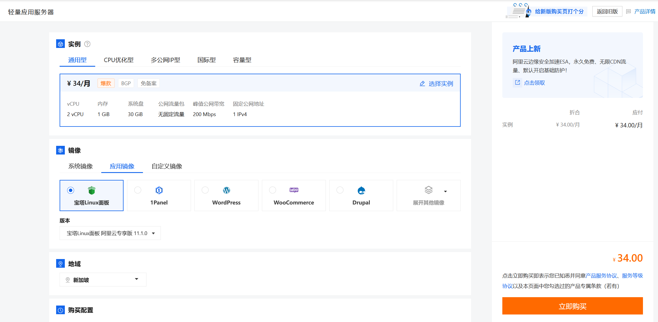 在产品选购界面,可根据需要选择指定的系统镜像,当然,也可以直接选择应用镜像,以Ailibaba Cloud Linux为系统,建立应用镜像。