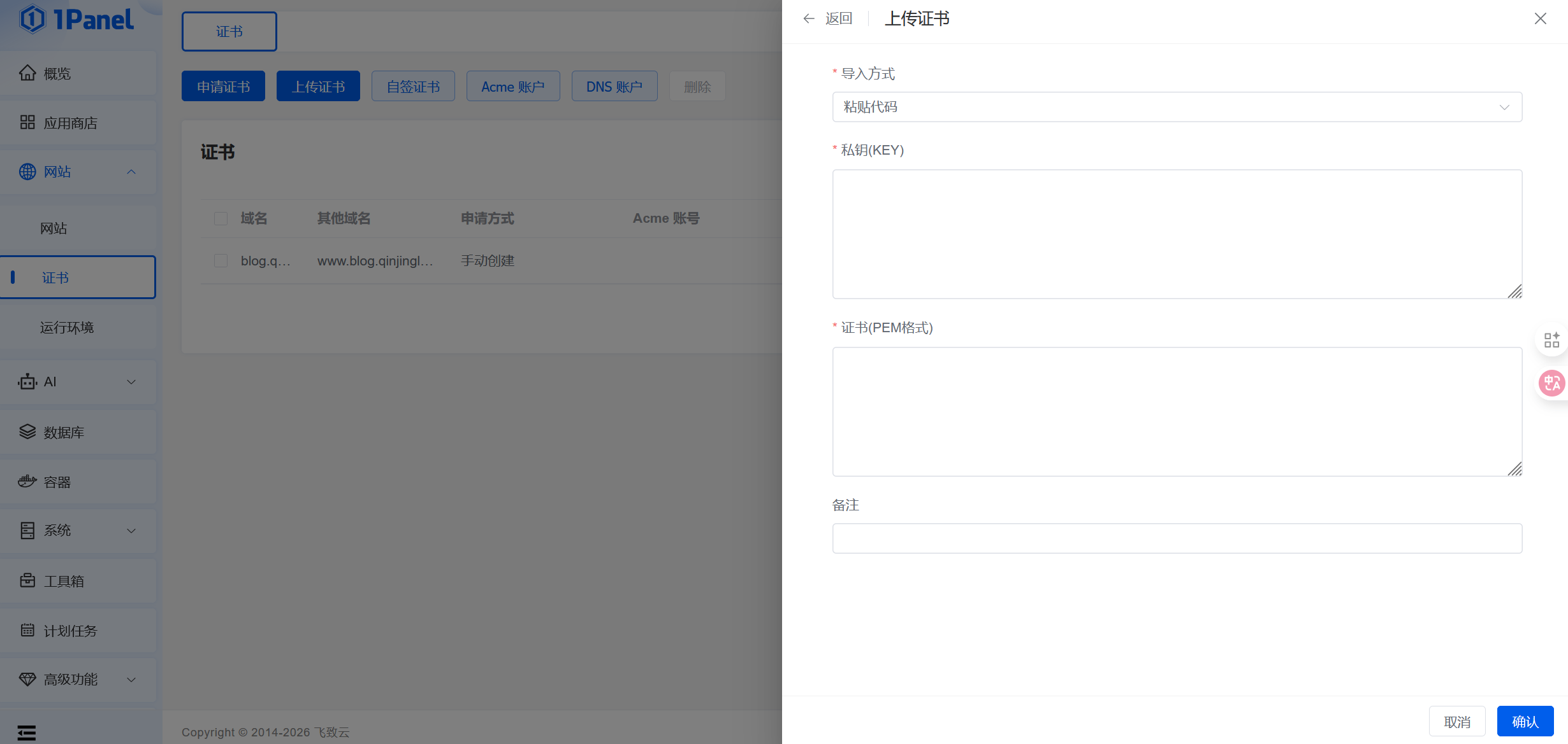 在1panel主页,网站-证书-上传证书,将前期申请好的SSL个人证书粘贴到此处。