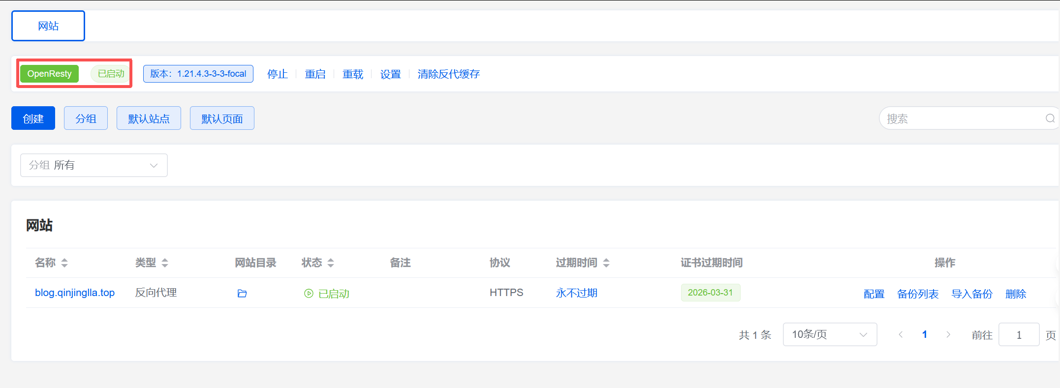 返回1panel控制台,在OpenResty启动的情况下点击创建。