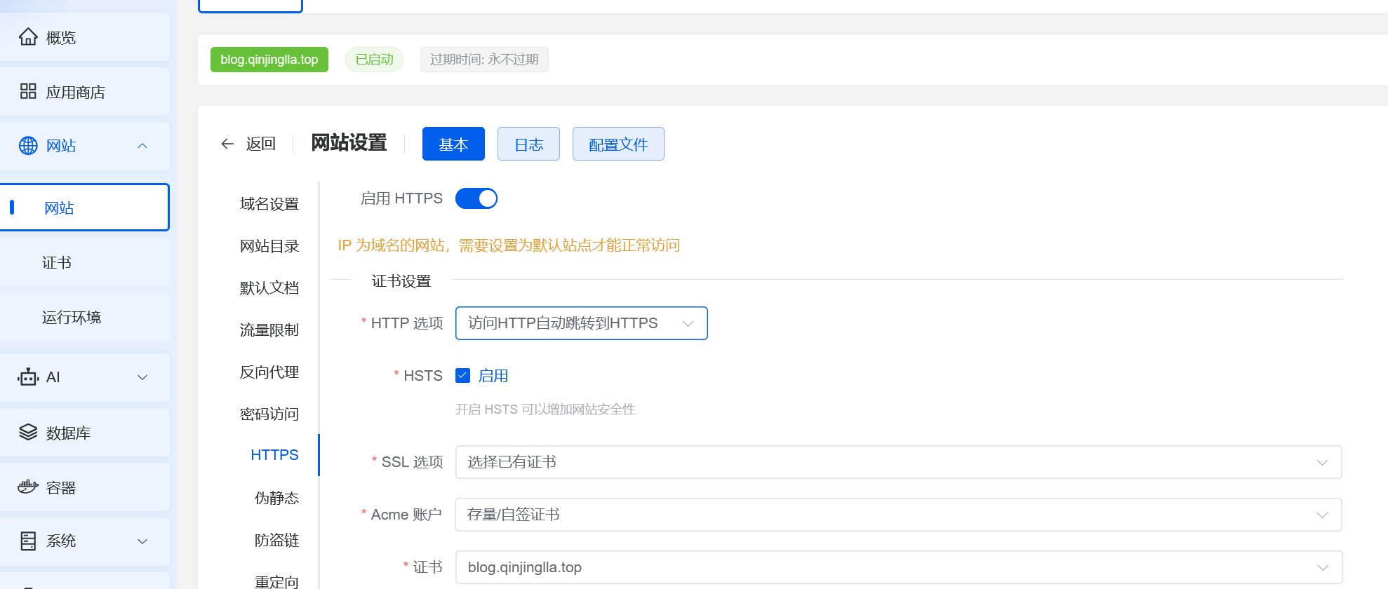 返回网站-网站,点击反向代理链接,在网站设置-HTTPS中启用HTTPS-选择已有证书即可。