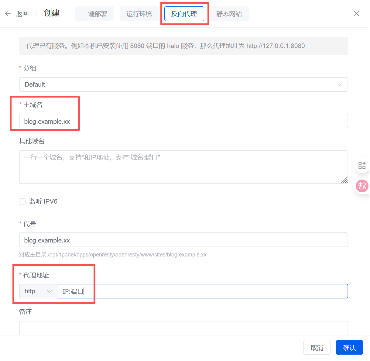 在反向代理中依次填入主域名、代理地址(127.0.0.1:Halo端口)。