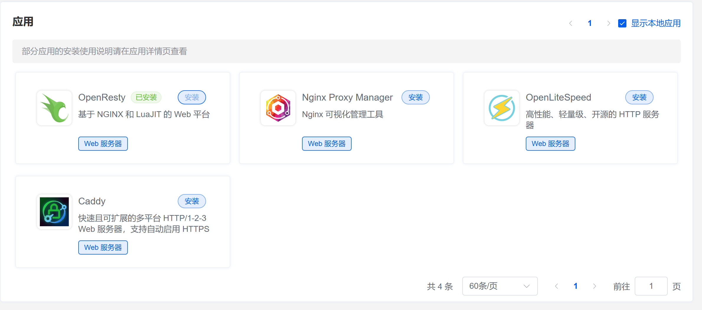 在1panel的应用界面,提供了一键式可视化的安装方式,点击安装,依照默认配置即可将web服务器安装成功。