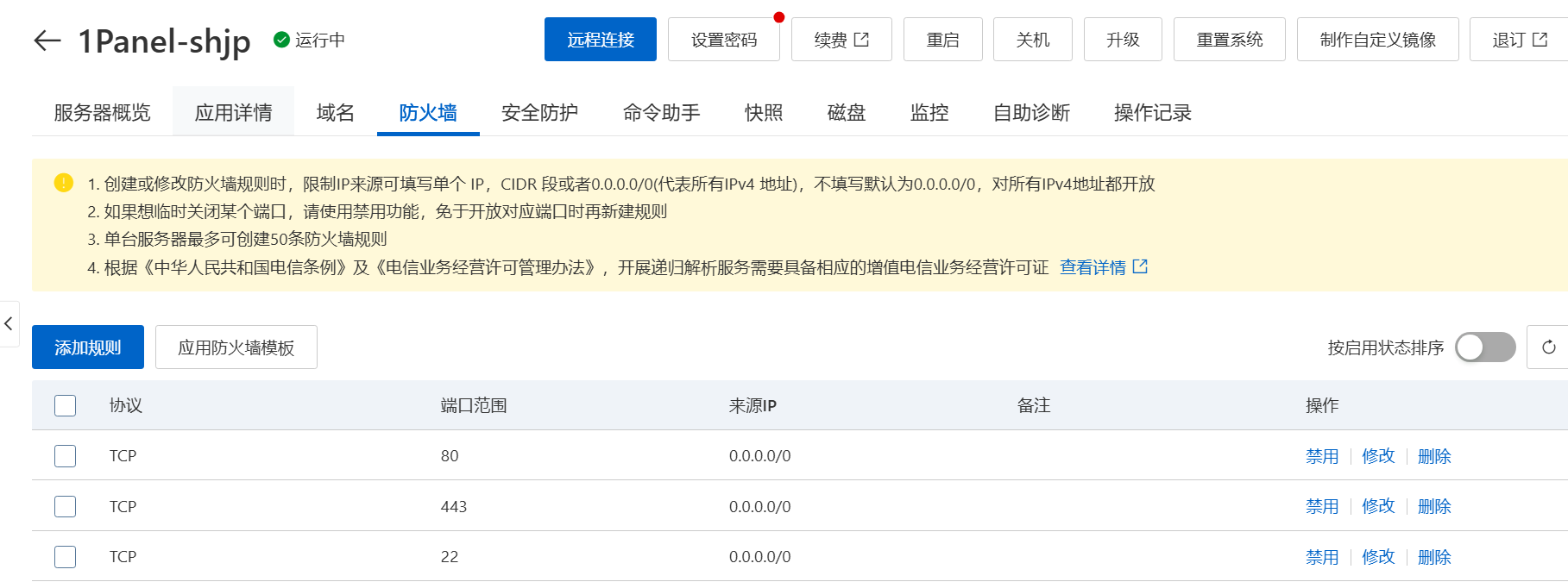 注:出于安全性考虑,Halo应用端口经过反向代理是无需放开的,但同样也无法通过IP:端口的方式访问。如果已完成反向代理,可将此时放开的端口关闭。