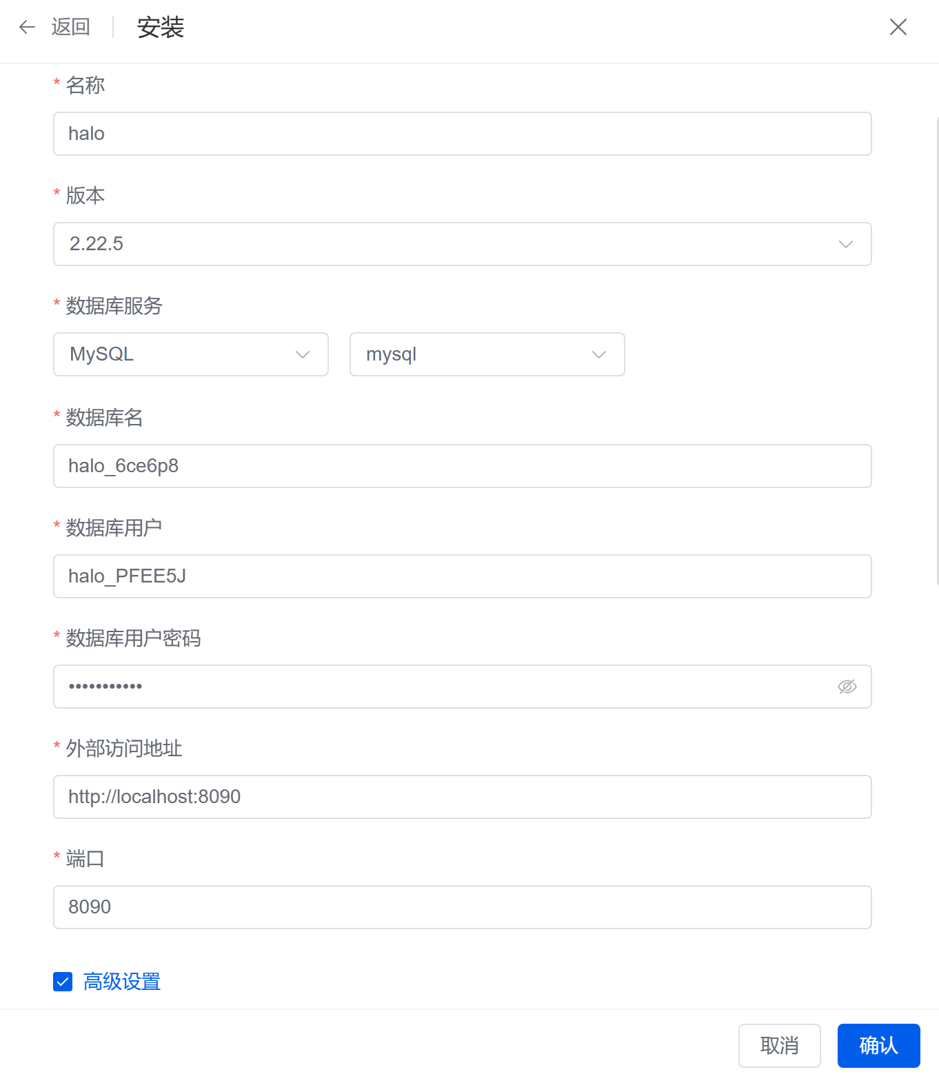在安装过程中,选择已经安装好的MySQL数据库,根据自己喜好配置好数据库相关信息即可。端口一栏,注意避开熟知端口号和1panel占用的端口号,同时要牢记你的Halo端口,下一步就要用到。