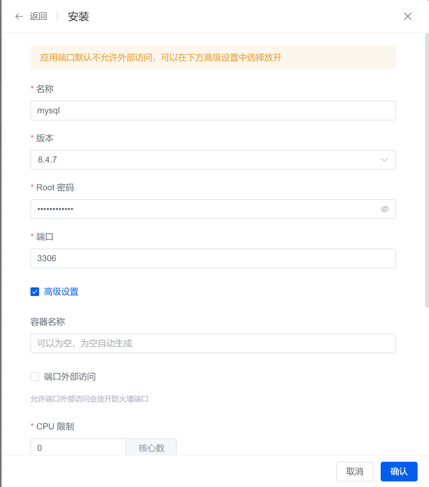 在安装时,注意设置强安全性密码,一般情况下无需打开端口外部访问(除非有其他服务器访问的需求),其余设置保持默认即可。