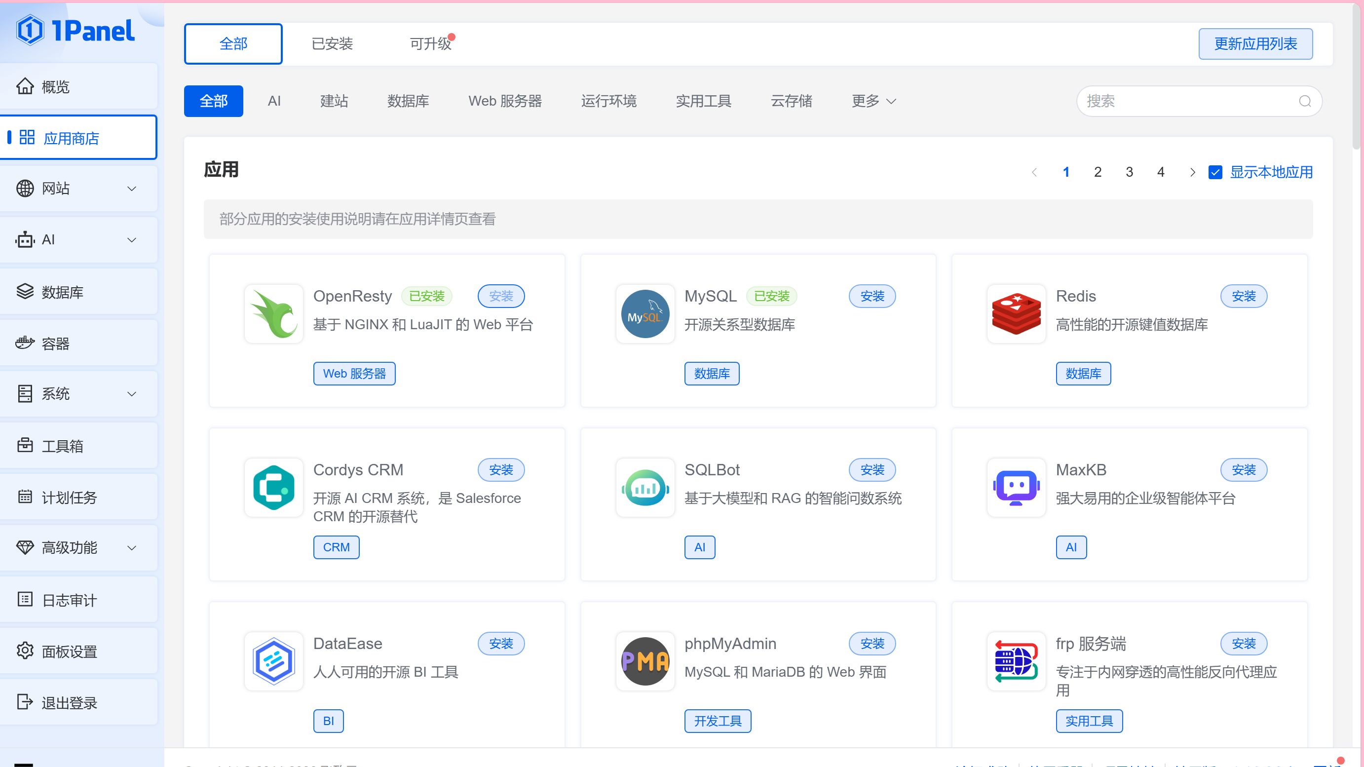 进入1panel首页(链接可通过阿里云控制台直接点击进入),登录成功后点击应用商店,即可选择需要的应用。